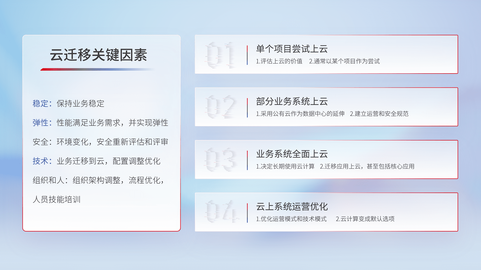 结合实际业务,,,,从规划设计、、云平台选型、、、云原生改造、、数据迁移、、、集成交付,,,,迁移全过程为客户识别最佳上云路径,,做好风险识别管理,,,,设计网络架构、、、身份权限、、、安全审计合规、、操作审计、、、日志审计、、、、监控告警策略、、、多站点容灾设计等,,,,对云上基础设施进行整体规划,,,提升IT治理水平,,,,以满足弹性、、高可用、、高性能的需求。。。